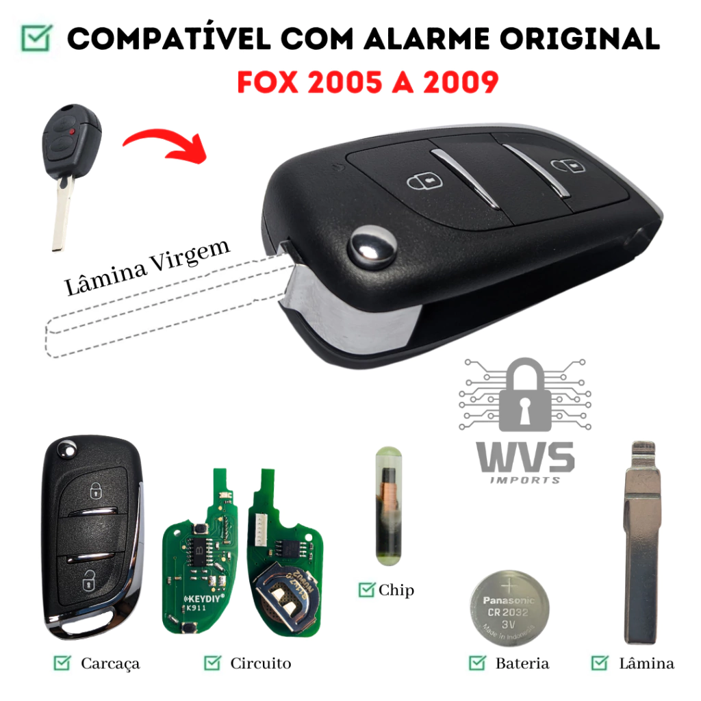 Chave Canivete Completa Volkwagen Fox, SpaceFox, CrossFox - 2005 a 2009 para Alarme Original, basta ir até um chaveiro para fazer a cópia da lâmina, codificar o chip e o controle..